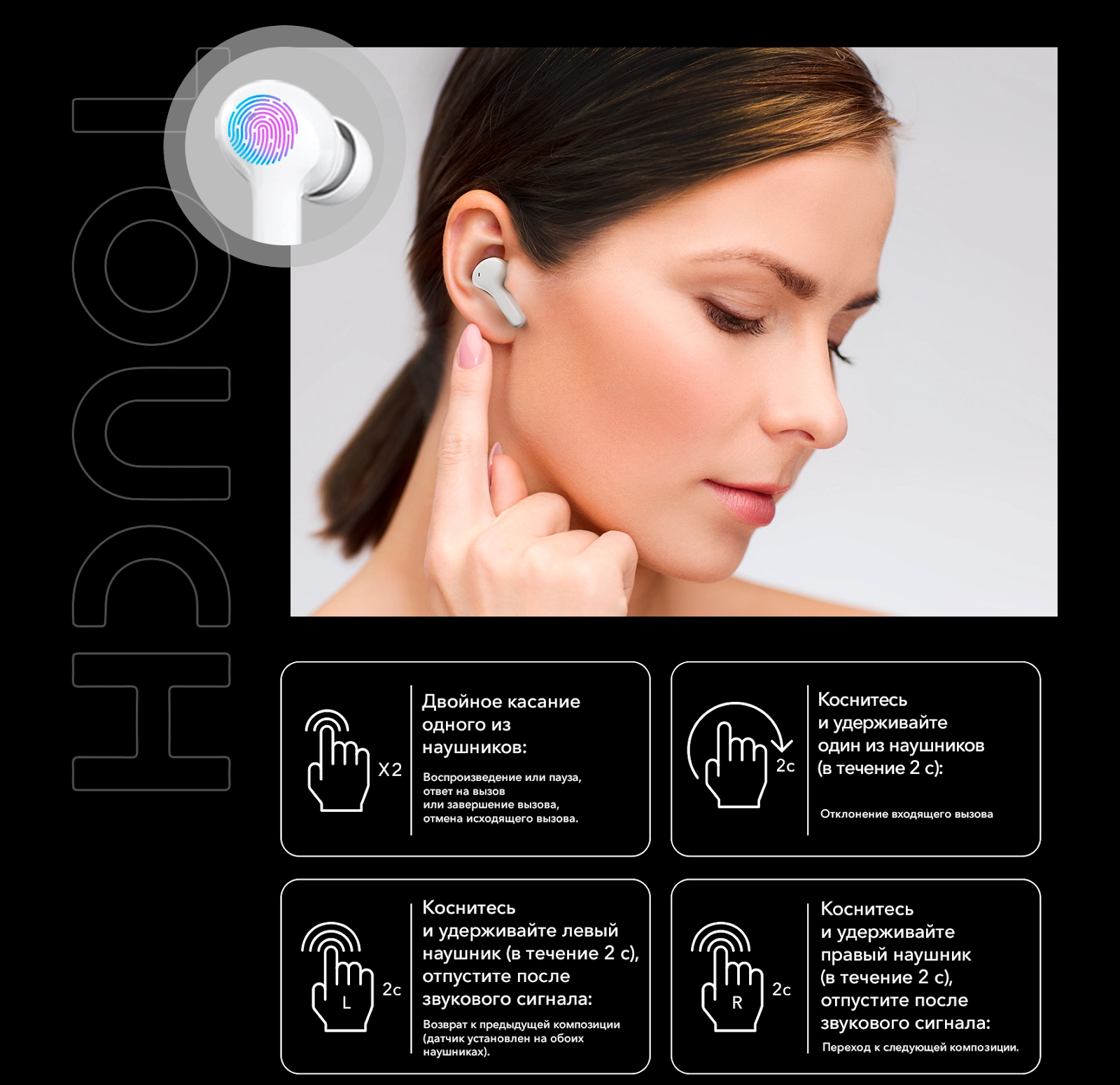 Оба наушника Honor Choice True Wireless Stereo Earbuds оснащены сенсорами, что позволяет осуществлять управление воспроизведением аудио при помощи простых касаний.