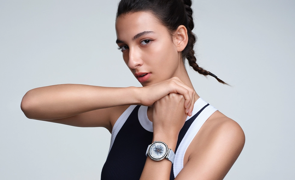 Устройство отличается лаконичным дизайном, круглый корпус с физическими кнопками выполнен из прочного металла, ремешок — из керамики. Крупный дисплей защищен ударопрочным и устойчивым к появлению царапин стеклом.