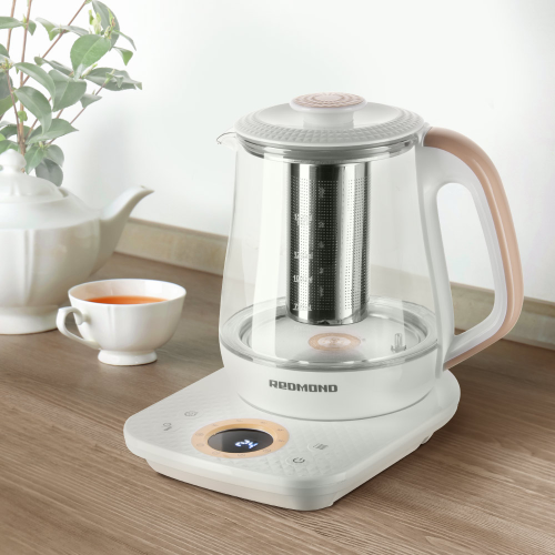 Электрочайник Redmond RK-G1307D объединяет в себе сразу несколько полезных функций. Кипятите воду, устанавливайте необходимую температуру подогрева или заваривайте чай прямо в стеклянной колбе.