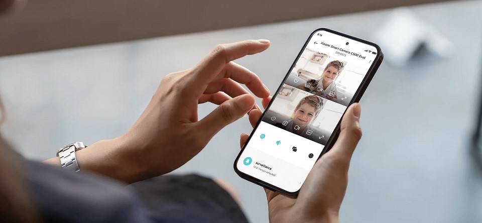 Камера оснащена двумя связанными объективами 4 Мп: основная фиксированная камера разрешением 1080p обеспечивает четкое и детализированное изображение, а дополнительная поворотная камера расширяет зону видимости. При необходимости можно получить вид помещения с двух сторон. Камеры уходят в спящий режим независимо друг от друга.