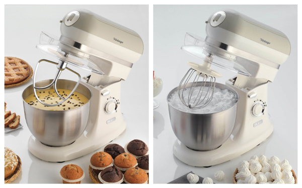 Выполненная в винтажном стиле кухонная машина Ariete 1588 Vintag станет украшением любой кухни, не занимая при этом много места. Прорезиненные ножки позволяют устройству прочно стоять на любой, даже стеклянной поверхности. Корпус — пластиковый, чаша для смешивания и насадки — из нержавеющей стали.