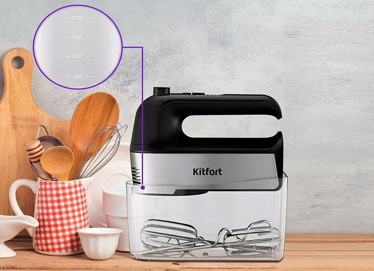 В ней удобно отмерять количество продуктов, а также на время оставлять миксер в процессе готовки. Провод питания длиной 0.9 м позволяет размещать прибор на значительном расстоянии от розетки. Благодаря весу 1.2 кг им комфортно пользоваться на протяжении долгого времени. Кнопка извлечения насадок позволяет быстро разобрать миксер для смены или очищения деталей.