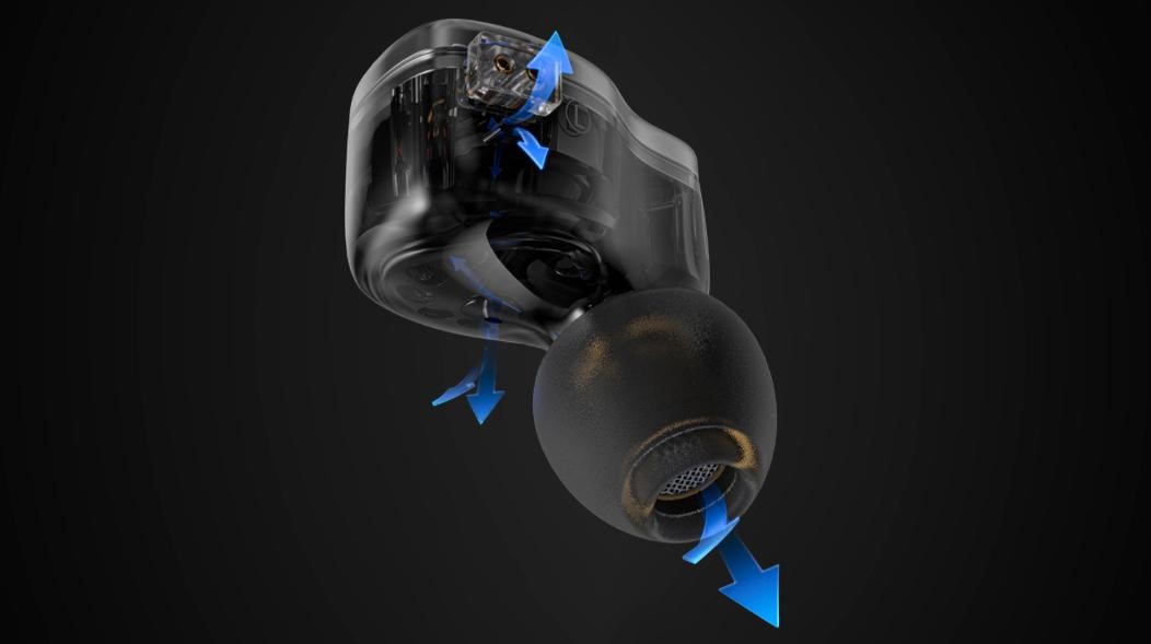 Размер динамика — 13.6 мм, что позволяет создавать мощный бас на низких частотах. Расположение арматурных драйверов уменьшает потери при воспроизведении высоких частот. Система сброса давления снижает нагрузку на барабанную перепонку и понижает искажение звука при воспроизведении басов.