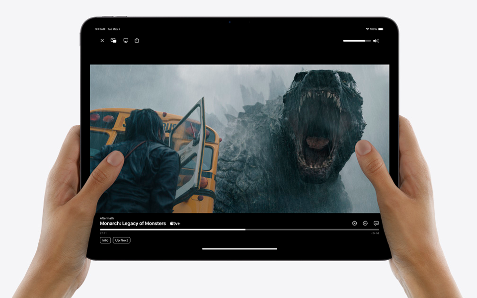 Увеличенный до 13 дюймов дисплей Liquid Retina получил разрешение 2732x2048, за счет чего изображение отличается высоким уровнем детализации. Экран хорошо подходит для просмотра фильмов и запуска игр благодаря точной цветопередаче, широким углам обзора и высокой контрастности. Пиковая яркость достигает 600 нит, на дисплее хорошо видно изображение под ярким солнцем. Технология True Tone автоматически настраивает цветовую температуру дисплея, чтобы она соответствовала условиям окружающей среды. Специальное покрытие защищает дисплей от бликов.