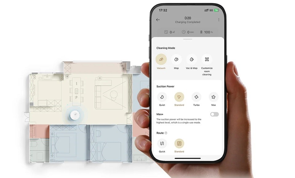 Можно создавать виртуальные запретные зоны, планировать уборку по времени или для конкретных комнат и отслеживать историю уборок. Док-станция компактного размера 130 х 126 х 93 мм и небольшого веса 0.37 кг легко интегрируется в интерьер и не занимает много места.