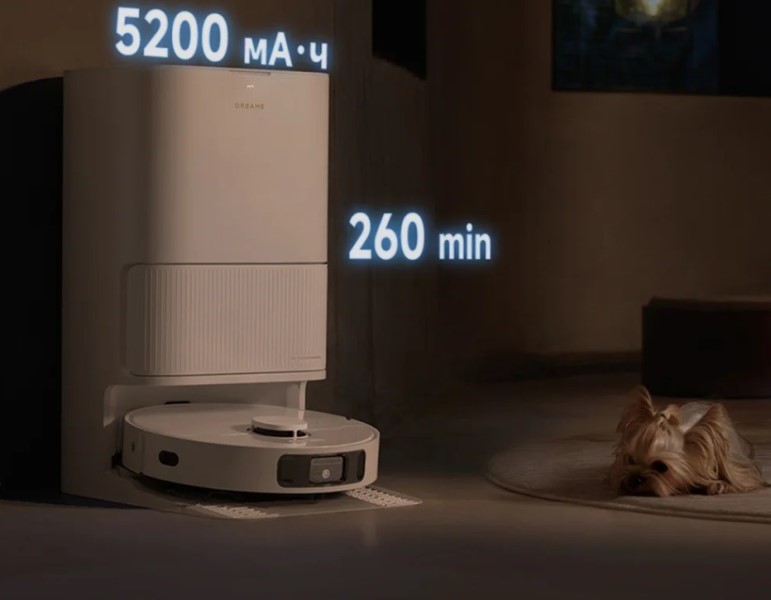 Аккумулятор емкостью 5200 мАч предоставляет до 260 минут непрерывной работы, что позволяет обрабатывать большие площади без перерыва. Полная интеграция с голосовыми помощниками и мобильным приложением предоставляет полный контроль над процессом уборки: можно создавать виртуальные карты, запретные зоны и индивидуальные сценарии очистки для каждой комнаты.