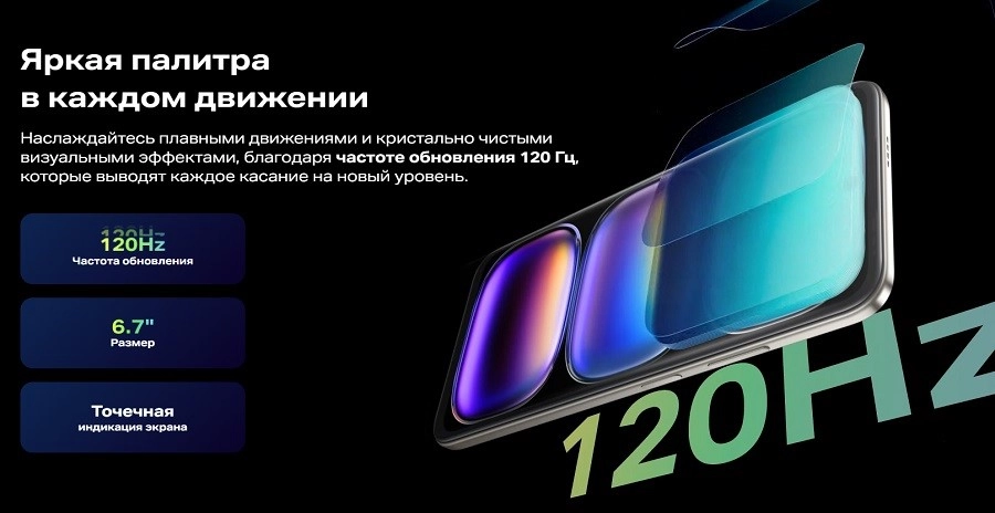Экран диагональю 6.7 дюйма и разрешением 1600 x 720 пикселей показывает яркое и детализированное изображение. Частота обновления достигает 120 Гц, что гарантирует плавность демонстрации любого динамичного контента и комфорт для глаз. Типовая яркость — 500 нит. Высокая чувствительность сенсоров позволяет касаться экрана даже влажными пальцами и получать мгновенный отклик.