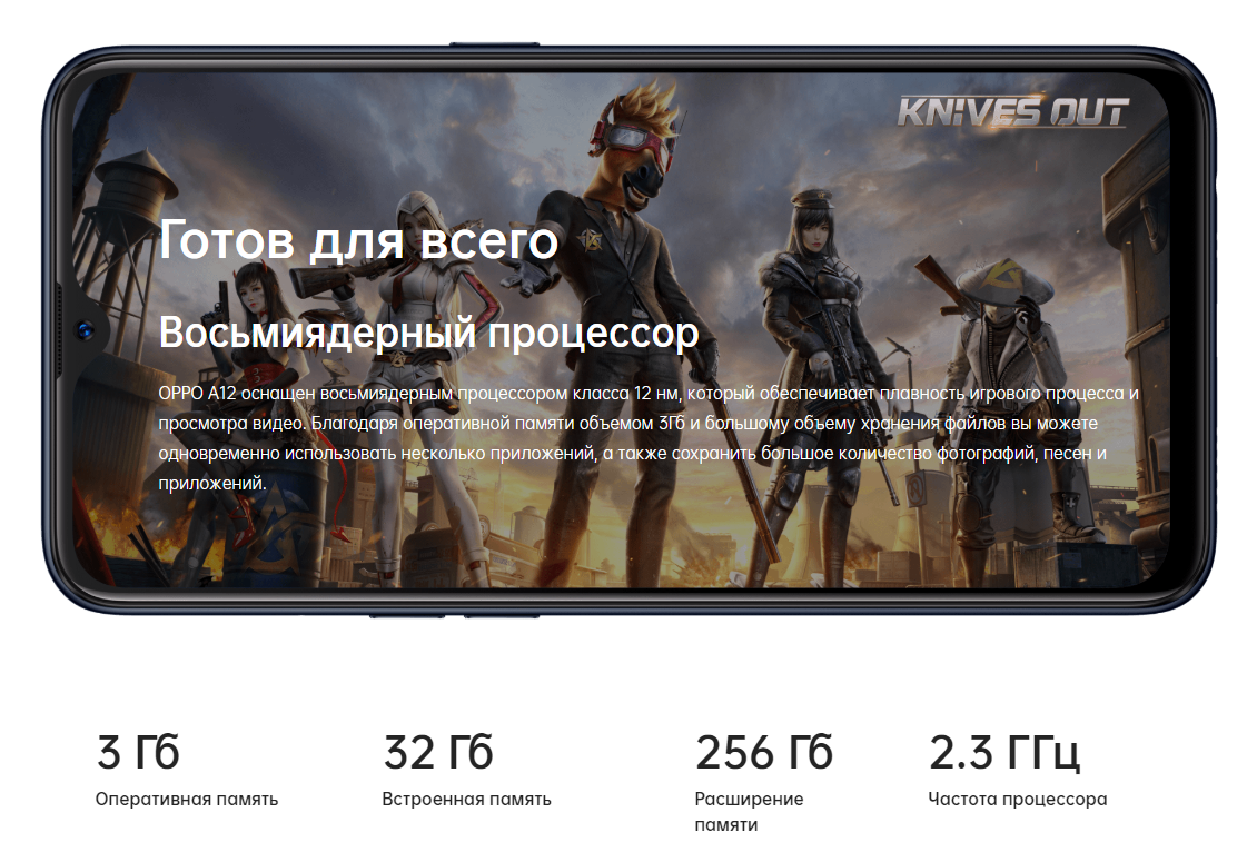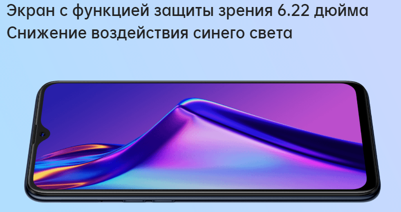 OPPO A12 выделяется оригинальным гранёным рисунком на задней крышке, которая может быть классического чёрного или морского синего цвета. Дополняет приятный внешний вид безрамочный экран и симпатичный каплевидный вырез под фронтальную камеру.