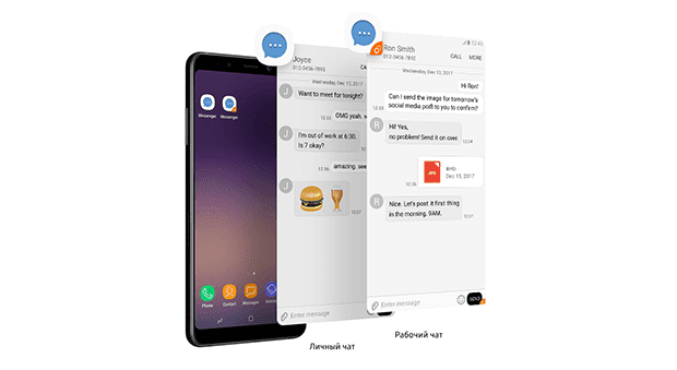 Настраивай общение в чатах, как тебе удобно. Смартфон Samsung Galaxy A8 позволяет установить два отдельных аккаунта для одного и того же мессенджера. Установить и управлять вторым аккаунтом в мессенджере можно с главного экрана или через меню "Настройки".