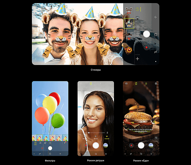 Редактируй фотографии, добавляя стикеры и фильтры. Ты можешь украсить селфи забавными стикерами с использованием технологии распознавания лиц. А также включить режим съемки еды, функцию ретуши и фильтры еще до того, как начнешь снимать. Функция ретуши работает и при съемке видео на фронтальную камеру, так что даже в роликах ты будешь выглядеть отлично.