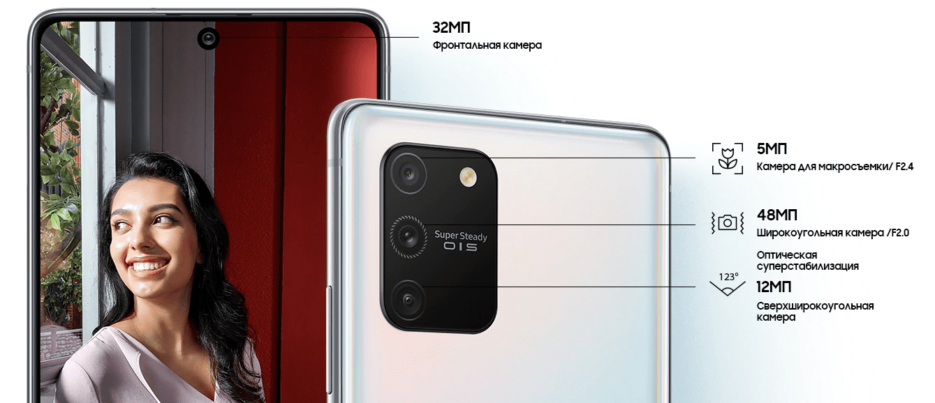 Продвинутая тройная камера Samsung Galaxy S10 Lite делает яркие и чёткие снимки днём и ночью. Основной модуль на 48 Мп обеспечивает высокую детализацию за счёт цепкого автофокуса и оптической стабилизации. 12 Мп модуль – это сверхширокоугольный объектив с углом охвата 123 градуса для создания крутых панорам. А 5 Мп макромодуль запечатлит мельчайшие детали объекта при съёмке крупным планом.