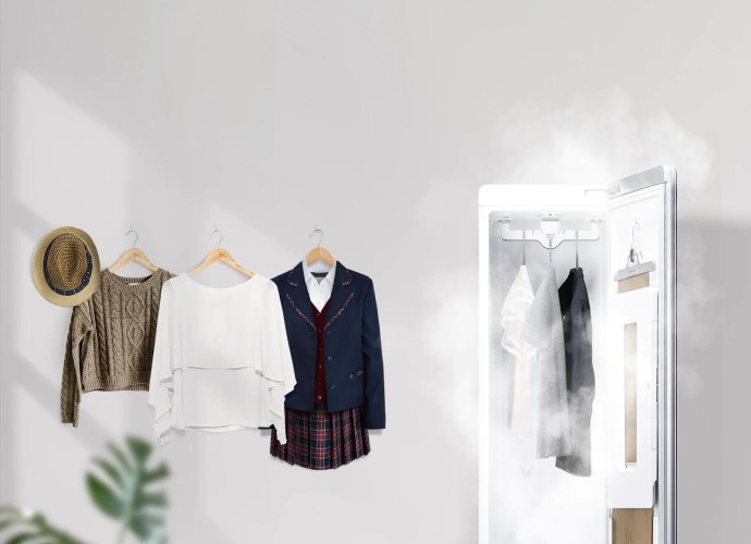 С виду стайлер для одежды LG Styler S3MFC напоминает платяной шкаф. Благодаря внушительным габаритам внутри помещаются сразу три вещи на плечиках и одни брюки, отсек для которых расположен в дверце прибора. Вешалки идут в комплекте.