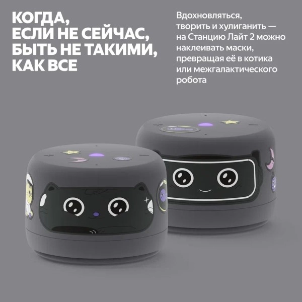 Со Станцией Лайт 2 дети¹ могут играть, хулиганить и превращать умную колонку в необычных персонажей. Например, можно наклеить на колонку маску котика или межгалактического робота. А стикерами из набора здорово украшать и умную колонку, и всё вокруг.
