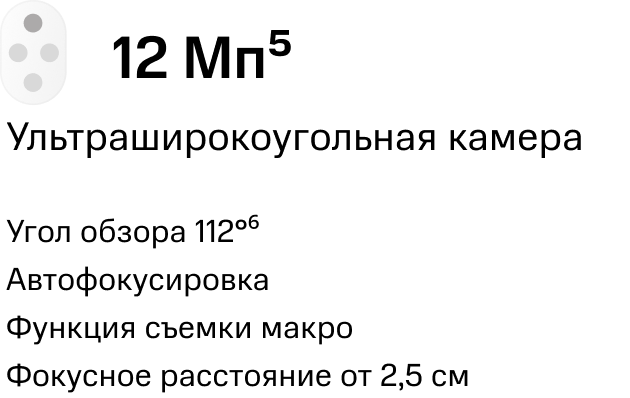 5. 12 Мп — разрешение сенсора ультраширокоугольной камеры. Фактическое разрешение зависит от выбранного режима съемки.