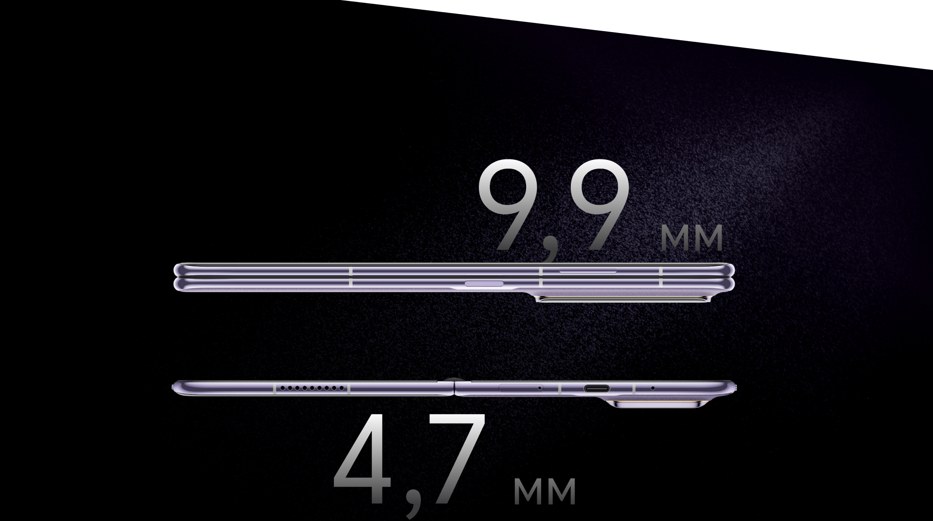 1. По данным лаборатории HONOR. Складной смартфон толщиной менее 1 см в сложенном состоянии. 9,9 мм — толщиина версии с черным кожаным корпусом в сложенном состоянии; 4,7 мм — в разложенном состоянии. При измерении не учитывалась толщина защитной пленки внешнего и внутреннего экранов, а также выступа камеры.