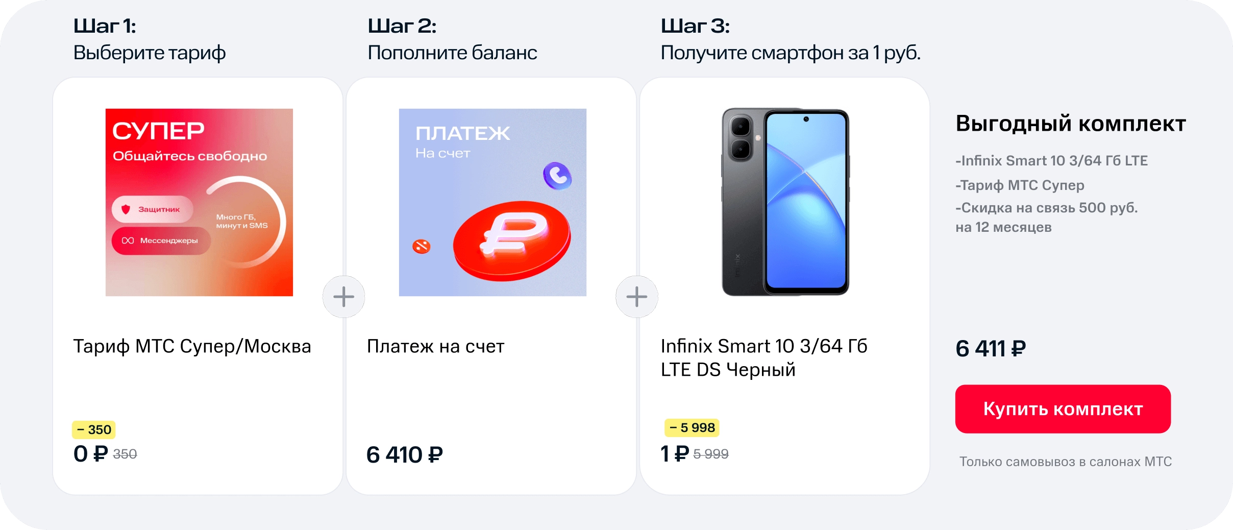 С 25.08.2025 по 31.01.2026 при покупке Комплекта: смартфона Infinix Smart 10 (Товар), опции на связь на 12 мес.* и SIM-карты** с тарифным планом, участвующим в акции, клиенту предоставляется возможность получить скидку, в т.ч. Товар за 1 руб. Акция действует только для новых абонентов Партнера Акции (ПАО «МТС»). Акция действует на один Комплект в чеке. Акция не действует совместно с другими акциями. Количество Товара ограничено. Товар может отличаться от изображения. Партнер акции вправе менять условия тарифных планов. Сумма скидки не подлежит выплате в денежном эквиваленте. Организатор акции вправе менять условия и период акции. Подробности – на shop.mts.ru.