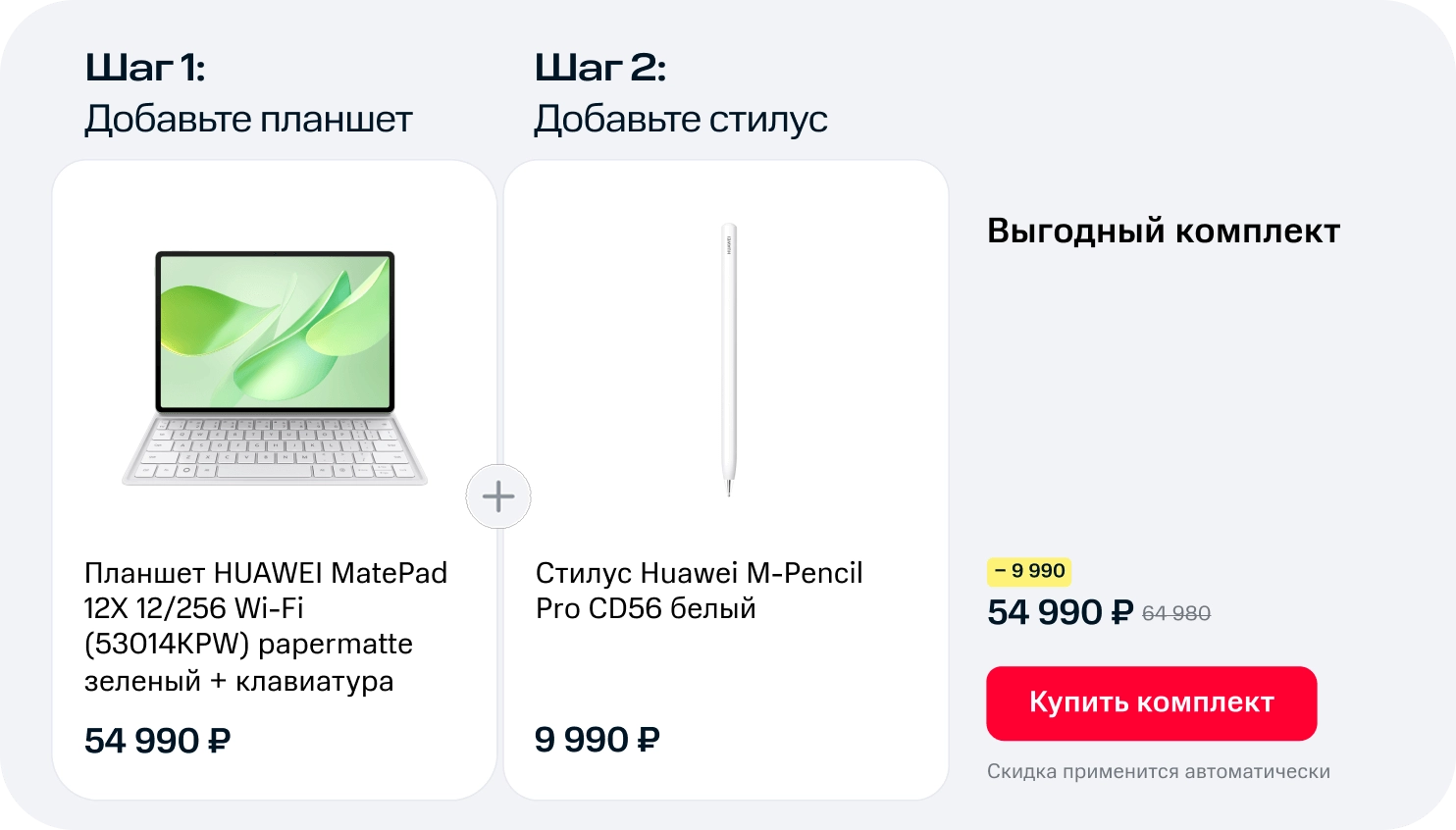 С 14.10.2025 по 24.11.2025 в магазинах МТС (Организатор акции - АО «РТК», ОГРН 1027739165662, 109147, Москва, ул. Воронцовская, д. 5 стр. 2) и магазине shop.mts.ru при покупке комплекта, состоящего из акционного планшета HUAWEI и стилуса, клиенту предоставляется возможность получить скидку на комплект в размере стоимости стилуса. Товар может отличаться от изображения. Организатор вправе менять условия, период акции, перечень Товаров. Подробности – на shop.mts.ru