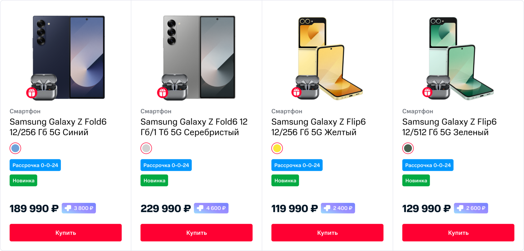 С 24.07.2024 г. по 06.08.2024 г. в магазинах МТС (АО “РТК”) и интернет-магазине shop.mts.ru за покупку смартфона Samsung Galaxy Z Fold6/ Z Flip6 (далее – Товар) клиенту предоставляется возможность получить Наушники Samsung Galaxy Buds3 Pro в подарок (далее – Подарок). Акция действует только на один Товар в чеке. Подробный перечень товаров, участвующих в акции, и условия ее проведения размещены на shop.mts.ru. Акция действует пока Товар есть в наличии. Товар, участвующий в акции, может отличаться от изображения на рекламных материалах. Организатор акции вправе менять условия и период проведения акции.