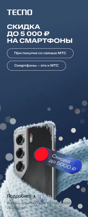 С 15.12.2025 г. по 31.01.2026 г. в салонах МТС (Организатор акции - АО «РТК», ОГРН 1027739165662, 109147, Москва, ул. Воронцовская, д. 5 стр. 2) и интернет-магазине shop.mts.ru при покупке комплекта: смартфона TECNO (Товар), участвующего в акции, SIM карты и Абонемента на Тарифный план «МТС Red» на 3 месяца или Тарифный план «МТС Больше» (Абонемент) - (далее Комплект) клиенту предоставляется скидка на Товар до 5 000 рублей. Акция действует на один Комплект в чеке. После окончания срока Абонемента взимается плата по тарифу (ТП) на стандартных условиях. Товар сертифицирован и может отличаться от изображения на рекламных материалах. Количество Товаров, участвующих в Акции, ограничено. Акция действует только для новых абонентов. Организатор Акции вправе менять условия и период проведения акции, перечень Товаров. Подробные условия уточняйте у Организатора акции.